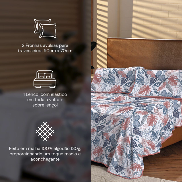 Acabamento: Fronha sem abas, lençol com elástico, não gera bolinhas, dispensa passadoria. A estampa da fronha condiz com a cor do lençol.
