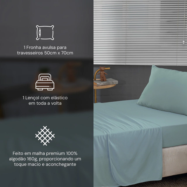 O Jogo de Cama com Lençol de Elástico e Fronha em Malha 100% Algodão possui tecnologia que proporciona a não geração de bolinhas, deixando o lençol e a fronha muito mais confortável e macio. O lençol possui elástico em toda sua volta, se adaptando mais facilmente ao colchão e sendo mais prático no momento de colocá-lo, mantendo-o sempre muito bem esticado na cama. As opções de cores combina com os mais variados gostos e composições com outras peças da nossa Linha Elegance e agrada gostos desde o minimalista até o mais clássico, pois possui diversas possibilidades de composições.