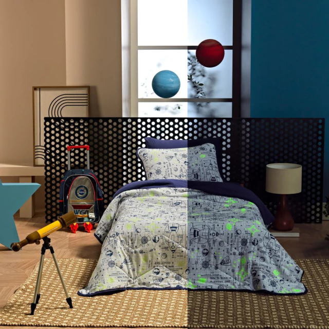 Kit Cobre Leito em Matelassê em Malha 100% Algodão 130gr/m², é Dupla Face, ou seja possui um lado estampado onde se encontram os elementos que brilham no escuro, e um lado liso na cor azul marinho permitindo que você varie na montagem da cama. O Kit Cobre Leito possui enchimento em 100% Poliéster com manta interna resinada em 60g/m², proporcionando um ótimo aquecimento e proteção corporal.