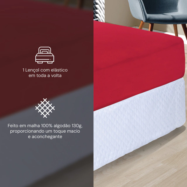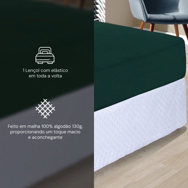 Peça coringa para sua decoração, versátil, básico e com opções de cores que possibilita muitas decorações com outros produtos na nossa Linha Europa. Confeccionado em Malha 100% Algodão, o Lençol com Elástico possui tecnologia que proporciona a não geração de bolinhas, deixando o lençol muito mais confortável e macio. O lençol possui elástico em toda sua volta, se adaptando mais facilmente ao colchão e sendo mais prático no momento de colocá-lo, mantendo-o sempre muito bem esticado na cama.
